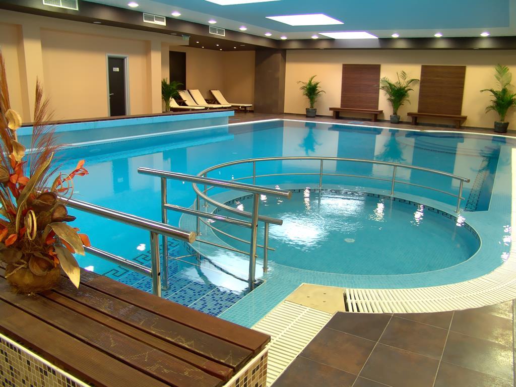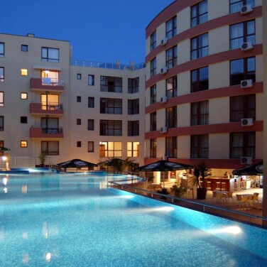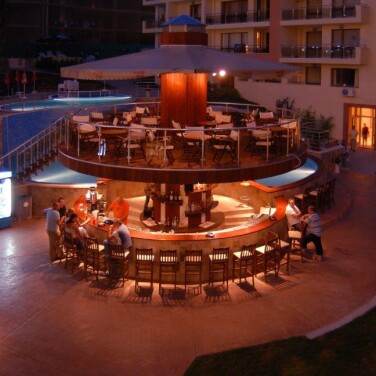 Отель состоит из нескольких соединяющихся корпусов, частично это номера, частично – апартаменты (некоторые из них – частная собственность). Мы жили в центральной части. В отеле есть несколько бассейнов: два открытых и вроде бы один крытый, но им мы не пользовались, ничего сказать не могу. Рядом с одним из бассейнов выстроен впечатляющий круглый бар, с барными стульями прямо в воде, но почему-то он не работал. Вокруг витали слухи, что первая половина июня для Несебра – это ещё не вполне сезон. Бар есть и в лобби.