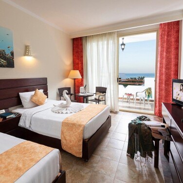 Номер просто шикарный, фото приложу, ощущение, что до нас там никто не жил. В номере двух спальная кровать, сейф, большой шкаф для вещей и душевая со стеклянной перегородкой. Так же был балкончик с видом на море (в отеле все номера с видом на море). В номере бесплатно: мыло для рук и гель для душа, чайные и кофейные пакетики, бутылка воды 1,5л на человека. Из платного мини бар. Поэтому шампунь, бальзам и тд берите с собой. Напротив дивана висит плазма, но только один русский канал. Уборка была каждый день, чисто!