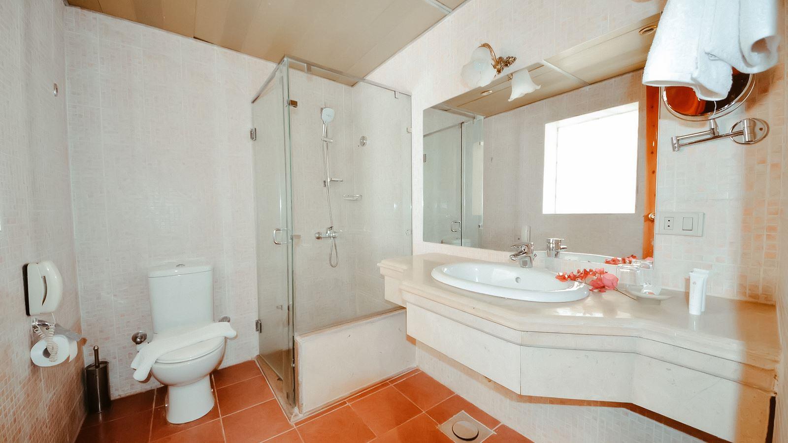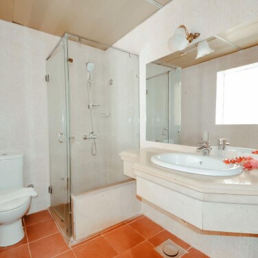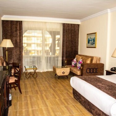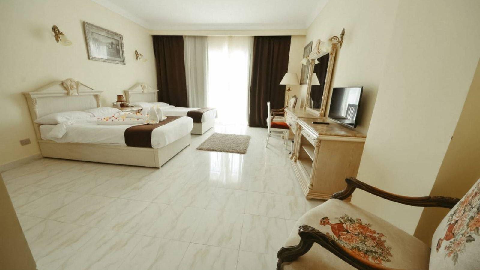 Наш номер — это просто песня! Огромный, светлый. Две двухспальные кровати сдвинуты вместе — получилось королевское ложе, простор для неги. Мебель — добротное дерево, множество тумбочек, столиков и шикарный шифоньер с сервантом. Мы, кстати, взяли с собой хрустальные бокалы, и им нашлось почетное место. Вид из окна открывался на бассейны и величественные Синайские горы — красота неземная. А какое удовольствие было возвращаться вечером в номер! Египтяне творили чудеса: причудливые фигурки из полотенец, а в последний вечер нас ждал сюрприз — кровать, усыпанная лепестками роз. Это было очень трогательно.