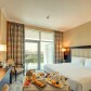Огромный. Я так и не понял: нам дали стандартный Superior или все же увеличенный Suite, потому что номер был квадратов 30-35. Помимо того, что там в целом было просторно, у нас была полноценная прихожая (коридор), вместительный шкаф на 6 дверей, большая ванная комната с биде, душ кабиной и отдельной ванной. В распоряжении номера: кинг сайз двуспальная кровать с 4 подушками (никаких постельных клопов и раздражений), холодильник, тв, сейф, гладильная доска и утюг, тапочки, все гигиенические средства (мыло, шампунь, гель для душа, кондиционер для волос, шапочки), чайник, посуда, чайные пакеты и кофе 3 в 1, вода 1 л. Полотенца все как положено (большое банное, для лица, для ног), а пляжное полотенце можно получить у бассейна. Розетки работали без переходников, можно с этим не заморачиваться. Кондиционер в номере работал прекрасно.